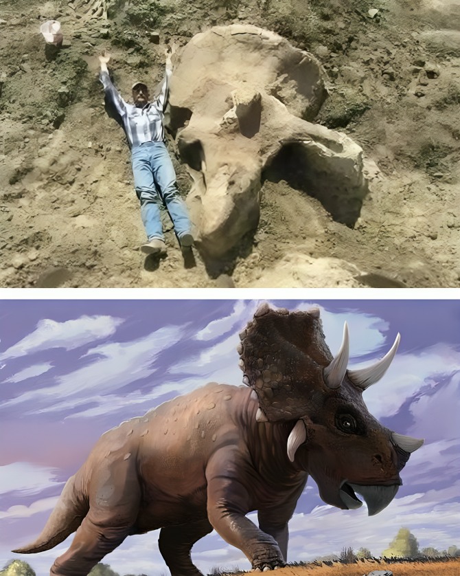 Представьте себе восторг от находки поистине монументального масштаба! На этом потрясающем снимке запечатлён момент изумления во время раскопок огромного черепа трицератопса.