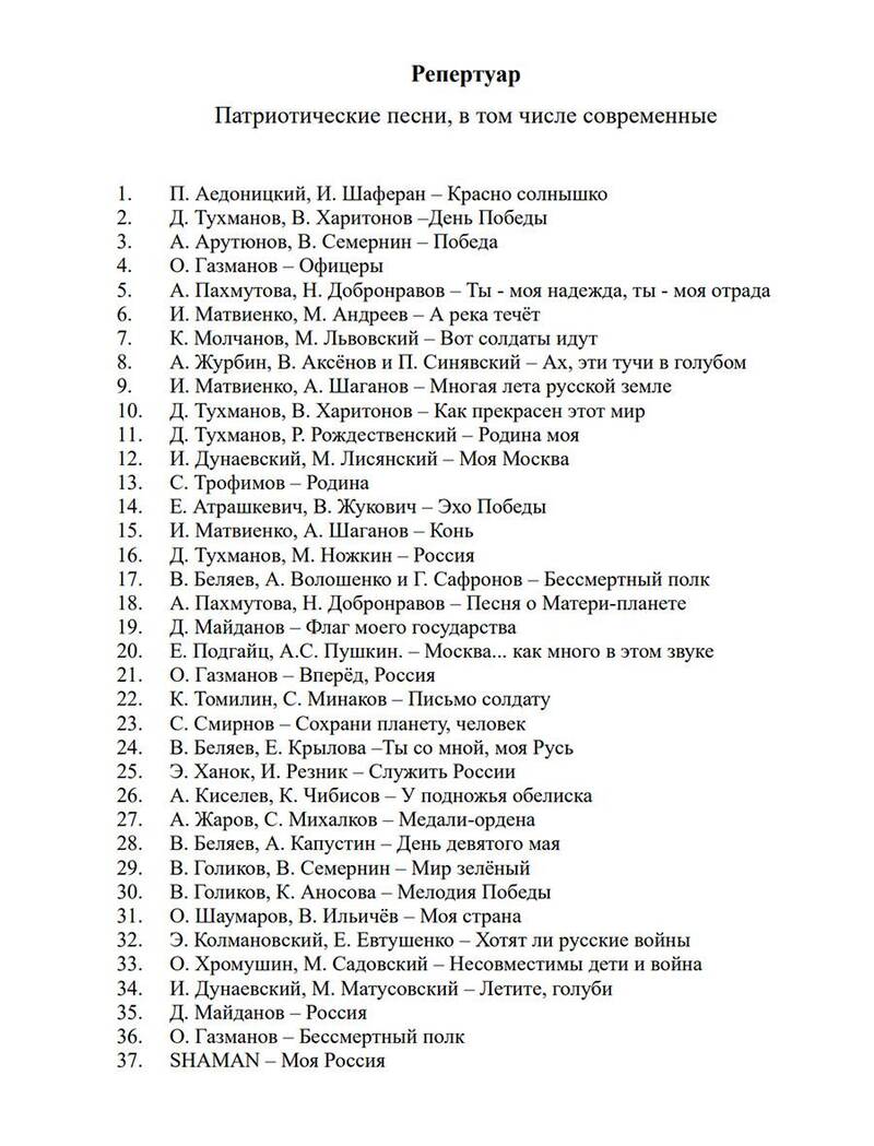 В список вошли 37 песен, направленных на патриотическое и духовно-нравственное воспитание обучающихся.