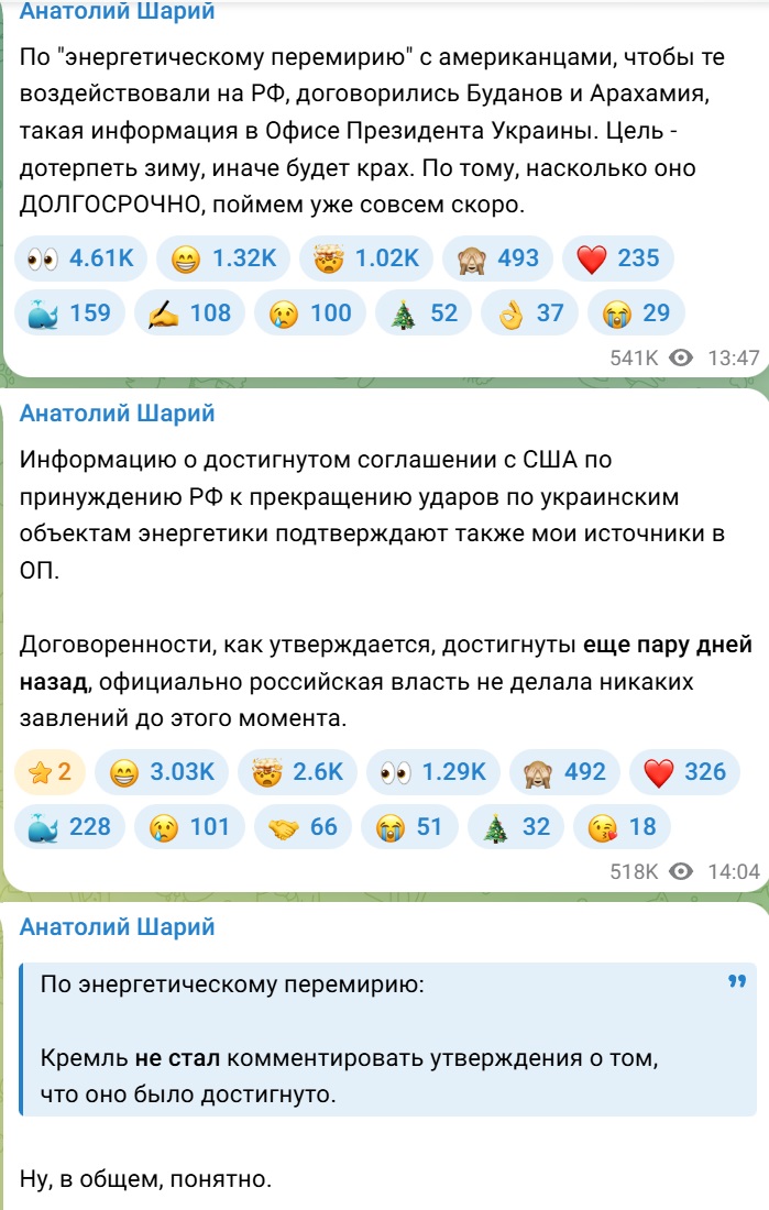 Говорят, что в Абу-Даби стороны договорились о временном моратории на удары по энергетике до определенной даты и уже по разным подразделениям прошел устный приказ о том, чтобы не бить по энергетике Украины.