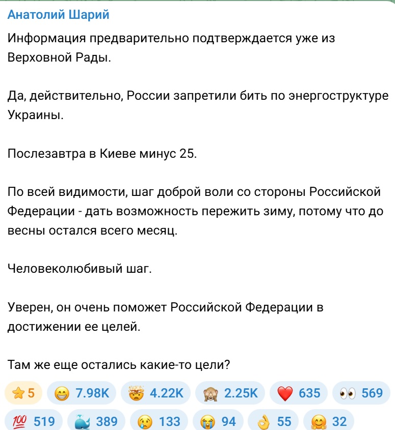 Уже стопятьсот раз об этом сказано и легче от того не делается. Во главе России - бездарная трусливая тварь, не имеющая ни ума, ни чести, ни стыда. И окружение за 25 лет он себе подобрал такое же. На этом фоне скорее стоит удивляться, что экономика за 4 года еще не развалилась, а армия продолжает воевать и даже медленно наступает.