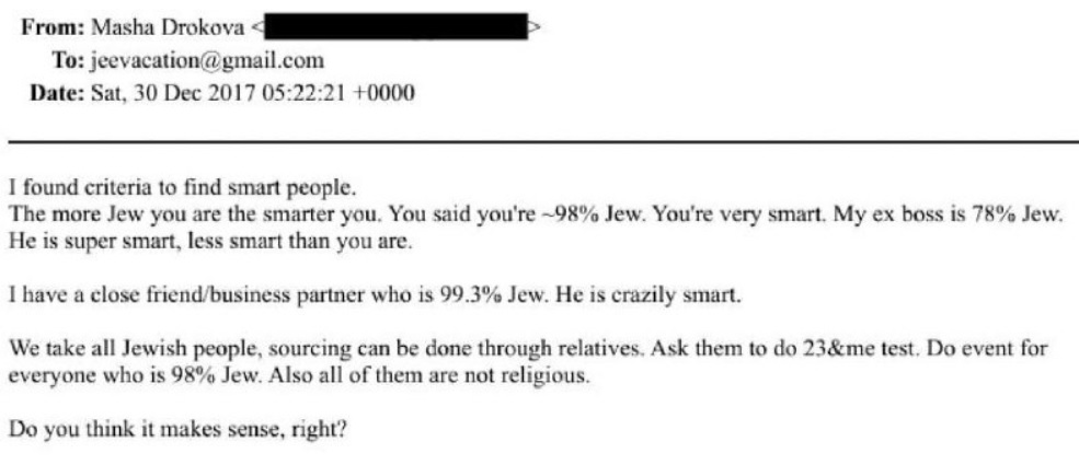 Маша нашла критерий как находить умных людей, чем больше ты еврей, тем умнее. Ты умный, говорил у тебя 98%, мой бывший босс тоже суперумный, поменьше, т.к. на 78% еврей. А близкий друг/деловой партнер на 99.3%, тот вообще безумно умный. Надо брать евреев, делать генетические тесты 23andMe https://en.wikipedia.org/wiki/23andMe