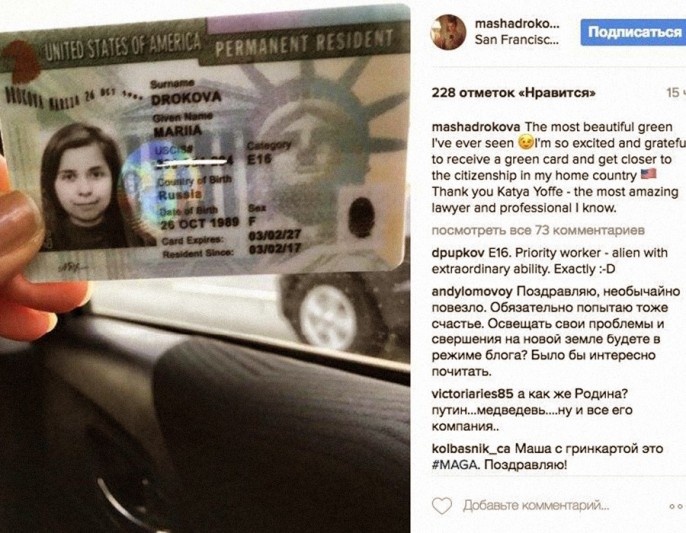 В 2017-м получила грин-карту категории E16 ("иностранец с выдающимися способностями"), о чём с восторгом сообщила в своём аккаунте в Instagram. "Самый красивый зелёный [цвет], который я когда-либо видела. Я так рада и благодарна получить грин-карту и стать ближе к гражданству в моей родной стране США. Спасибо Кате Иоффе — самый удивительный и профессиональный юрист, которого я знаю", - написала бывшая "патриотка"; к фото с грин-картой проставлен геотег международного аэропорта Сан-Франциско. В январе 2018-го она создала в Кремниевой долине собственный венчурный фонд Day One Ventures (который инвестировал в такие компании, как Superhuman, FutureFamily, DigitalGenius, Domuso, Atoms, CatalogDNA и Nebia), профинансированный тем же эмигрантом-миллиардером Белоусовым. В 2019-м включена в список Forbes 30 Under 30 в категории "Венчурный капитал", ненадолго навестила Россию и выступила на Петербургском международном экономическом форуме
