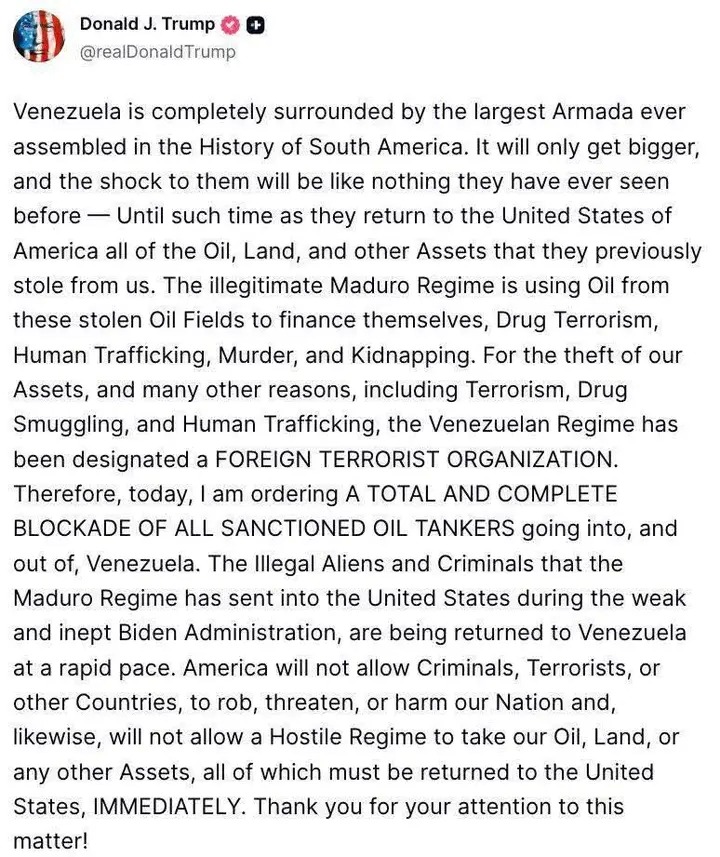 Новости уже слышали, коллеги? Трамп объявил полную блокаду Венесуэлы, "пока они не вернут нашу нефть, нашу землю, и все ресурсы, которые они у нас украли".
